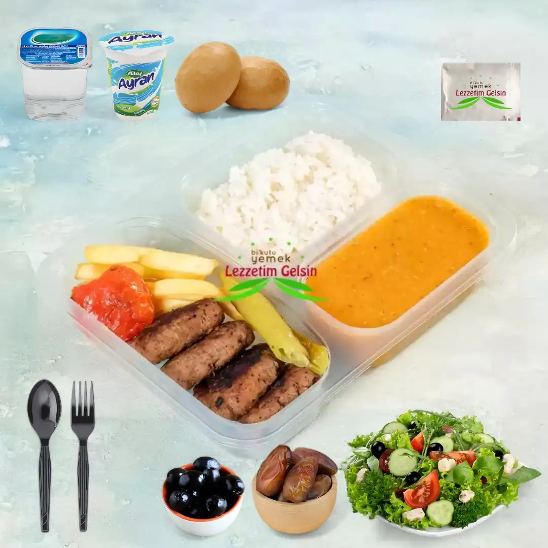 Tereyağlı Pilav + Ezogelin Çorba + Izgara Köfte + Patates Kızartması + Domates ve Biber + Ayran