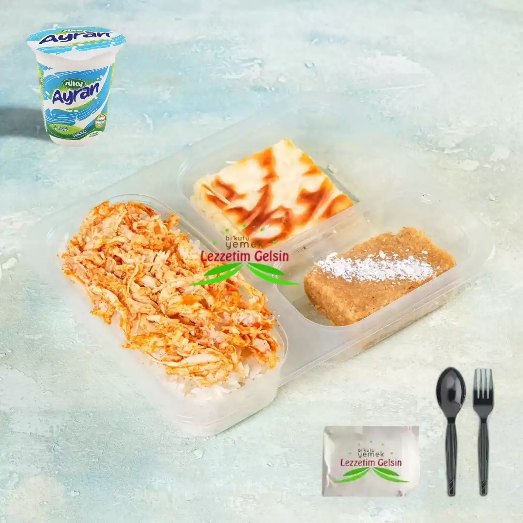 Soslu Didilmiş Tavuklu Tereyağlı pilav + İrmik Helvası + 1 Dilim Su Böreği + Ayran
